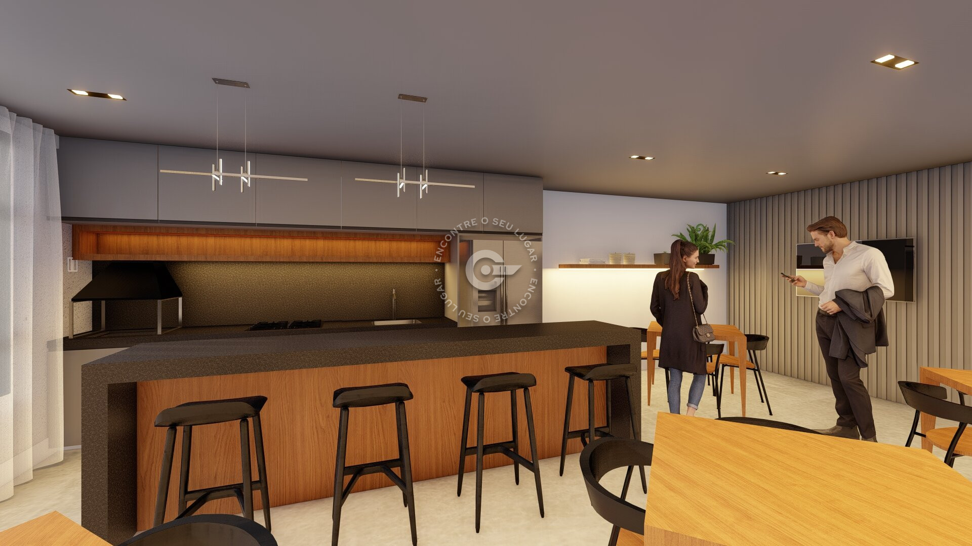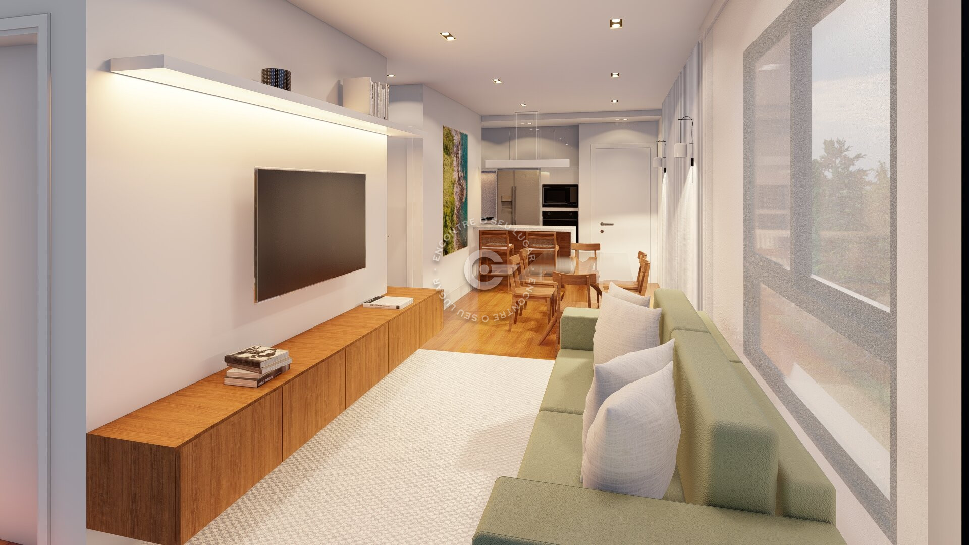 O apartamento possui planta bem distribuída, com sala e cozinha integradas, boa iluminação natural, banheiro social, lavanderia e sacada com churrasqueira. Conta ainda com duas vagas de garagem.