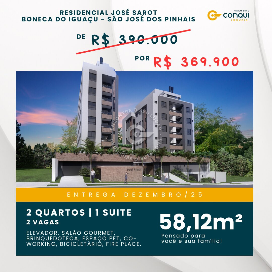 Apartamento à venda em São José dos Pinhais — 2 quartos (1 suíte), sacada com churrasqueira e 2 vagas.