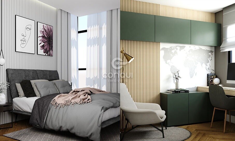 O sistema construtivo diferenciado oferece flexibilidade para escolher entre um living ampliado, menos quartos ou até um grande closet, tornando seu apartamento único. As paredes internas em drywall e as lajes planas sem vigas facilitam essas adaptações com qualidade e segurança.