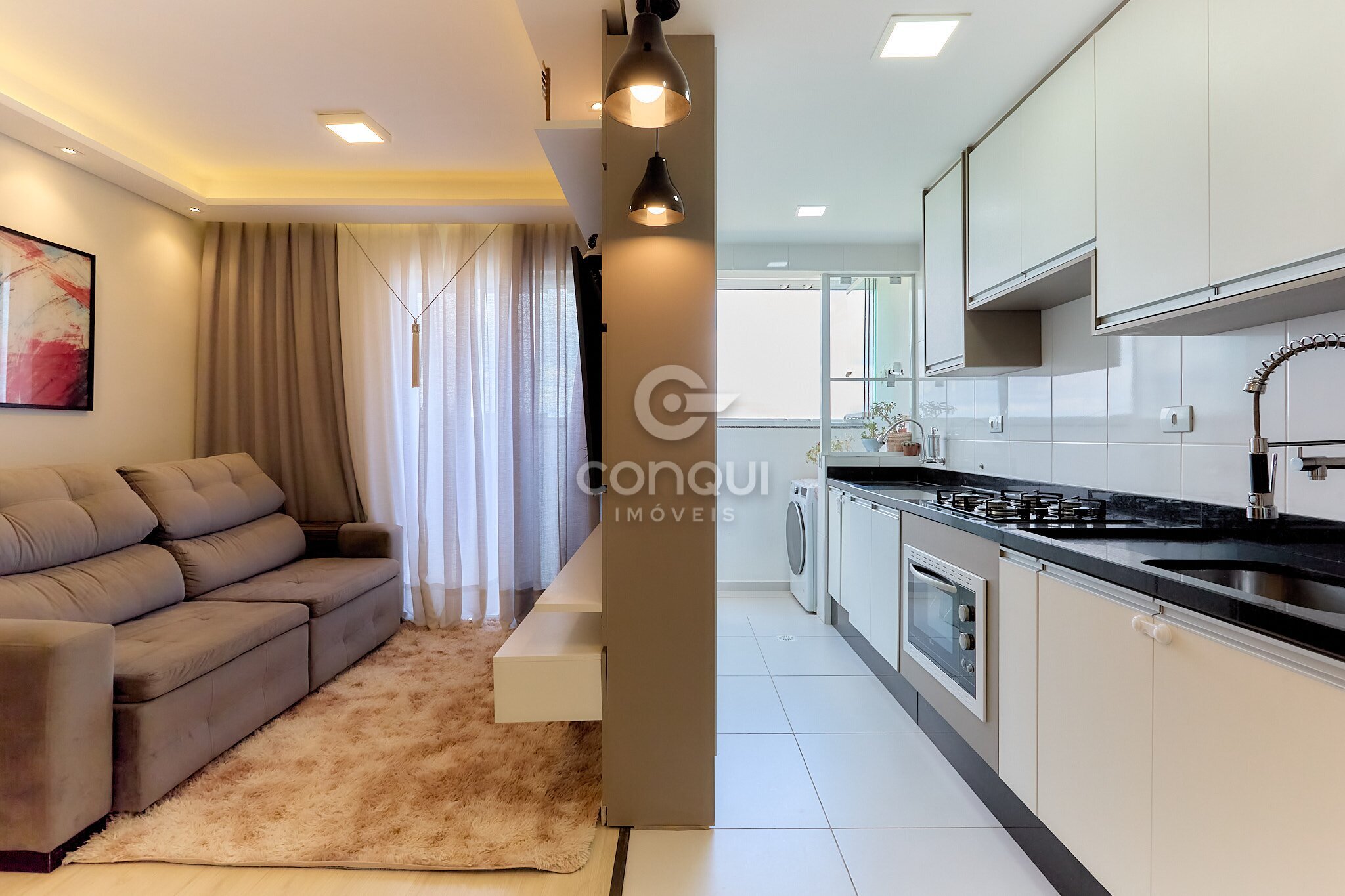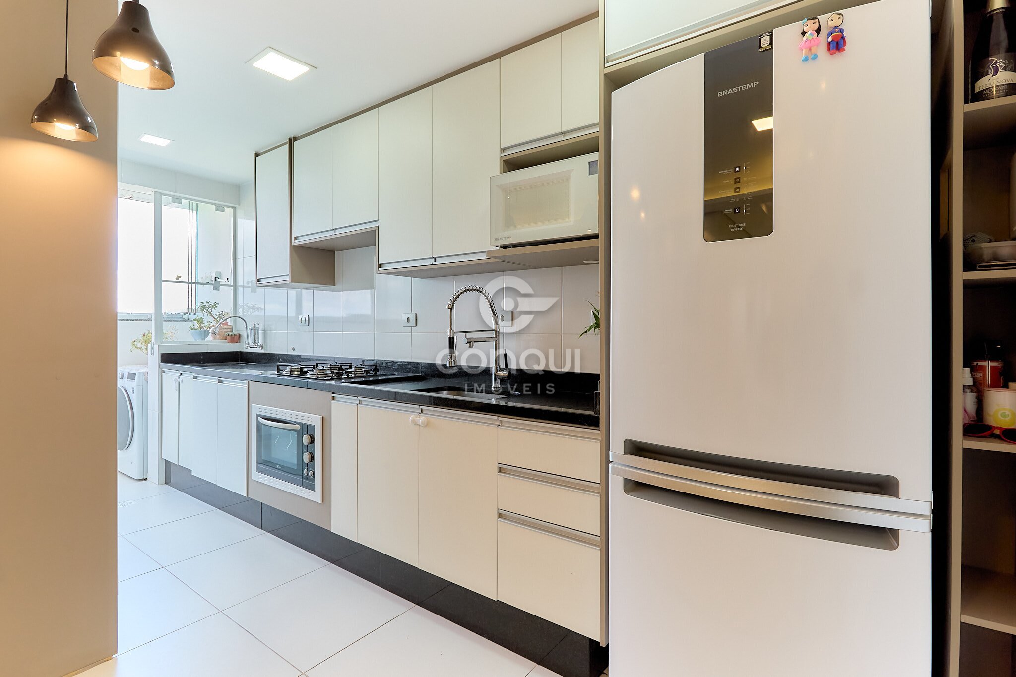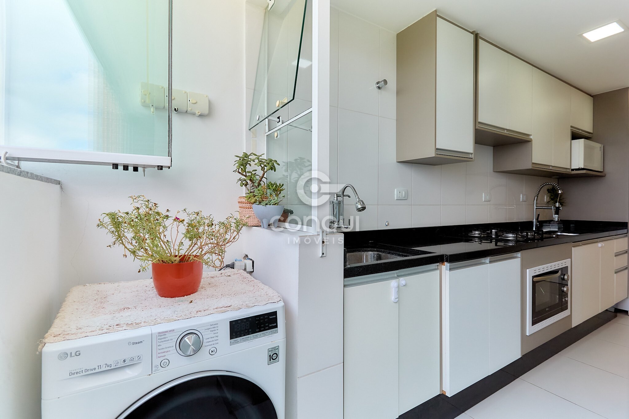 A sacada fechada em vidro com churrasqueira amplia a área social e permite aproveitar o espaço em qualquer época do ano, trazendo mais conforto e funcionalidade ao imóvel. A cozinha com móveis planejados contribui para organização e melhor aproveitamento dos ambientes.