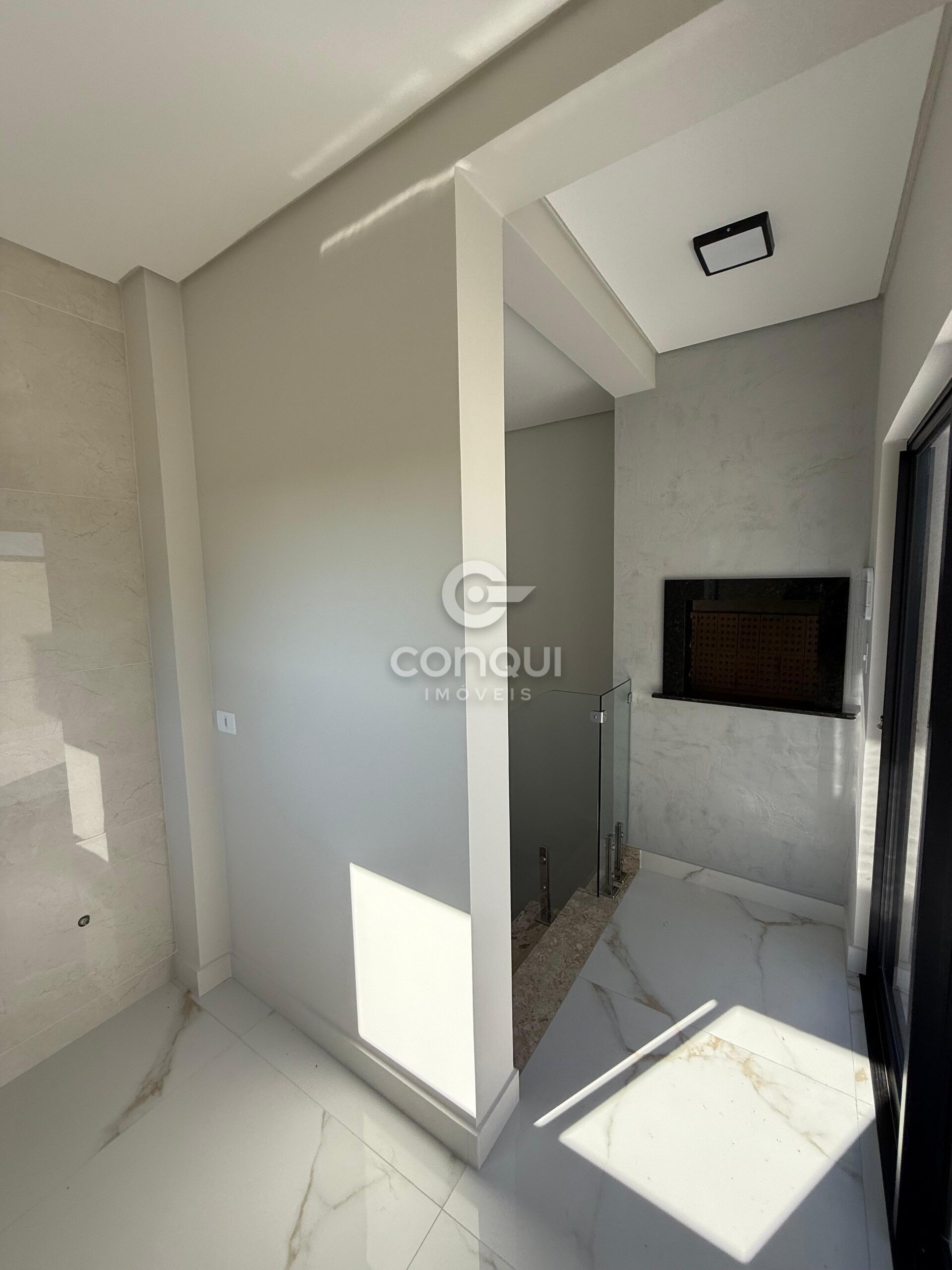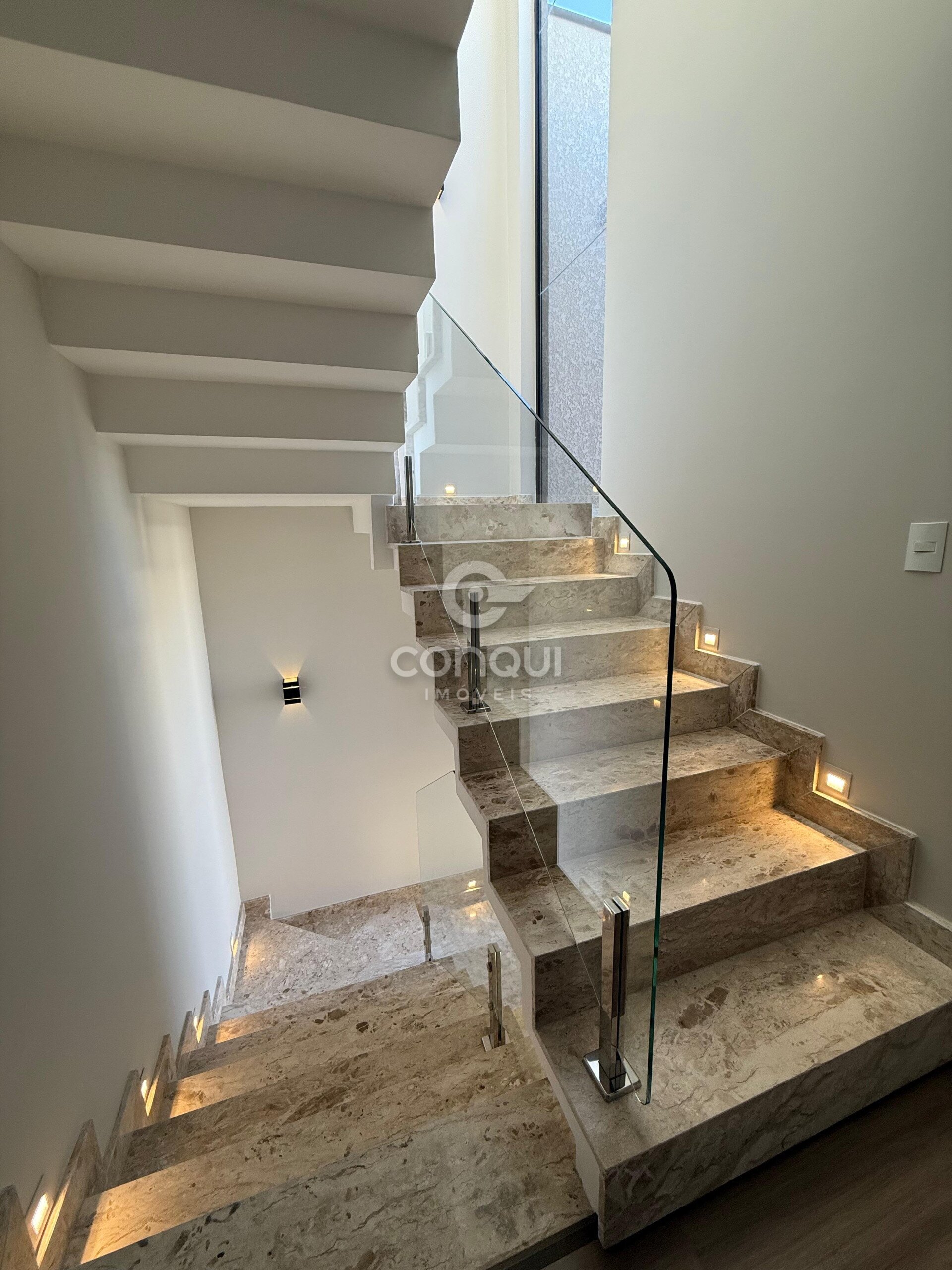 Escada em mármore com guarda-corpo em vidro.